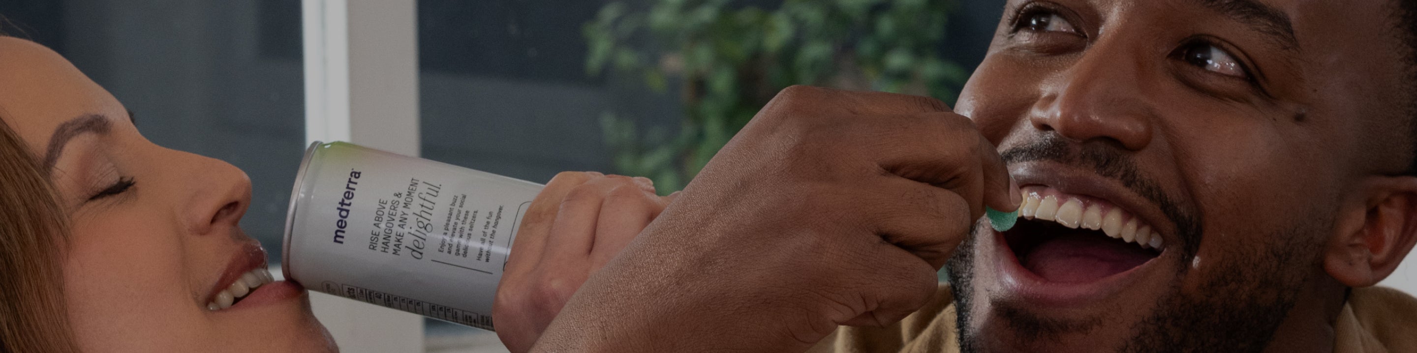 A smiling woman holds a cold beverage bottle for a man, who appears to be drinking from it. Both individuals are enjoying the moment in what appears to be a relaxed, indoor setting with a green plant and window visible in the background. A smiling woman holds a cold beverage bottle for a man, who appears to be drinking from it. Both individuals are enjoying the moment in what appears to be a relaxed, indoor setting with a green plant and window visible in the background.